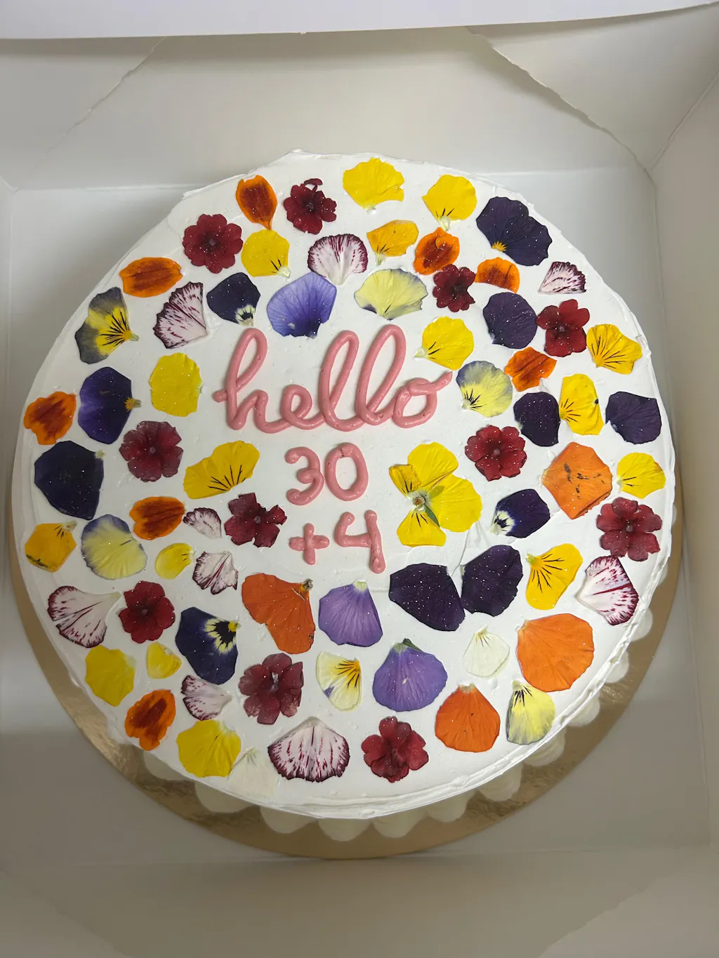 Te ofrecemos un bizcocho húmedo de coco y naranja relleno de dulce de leche cubierto con butter cream y decorado con una frase